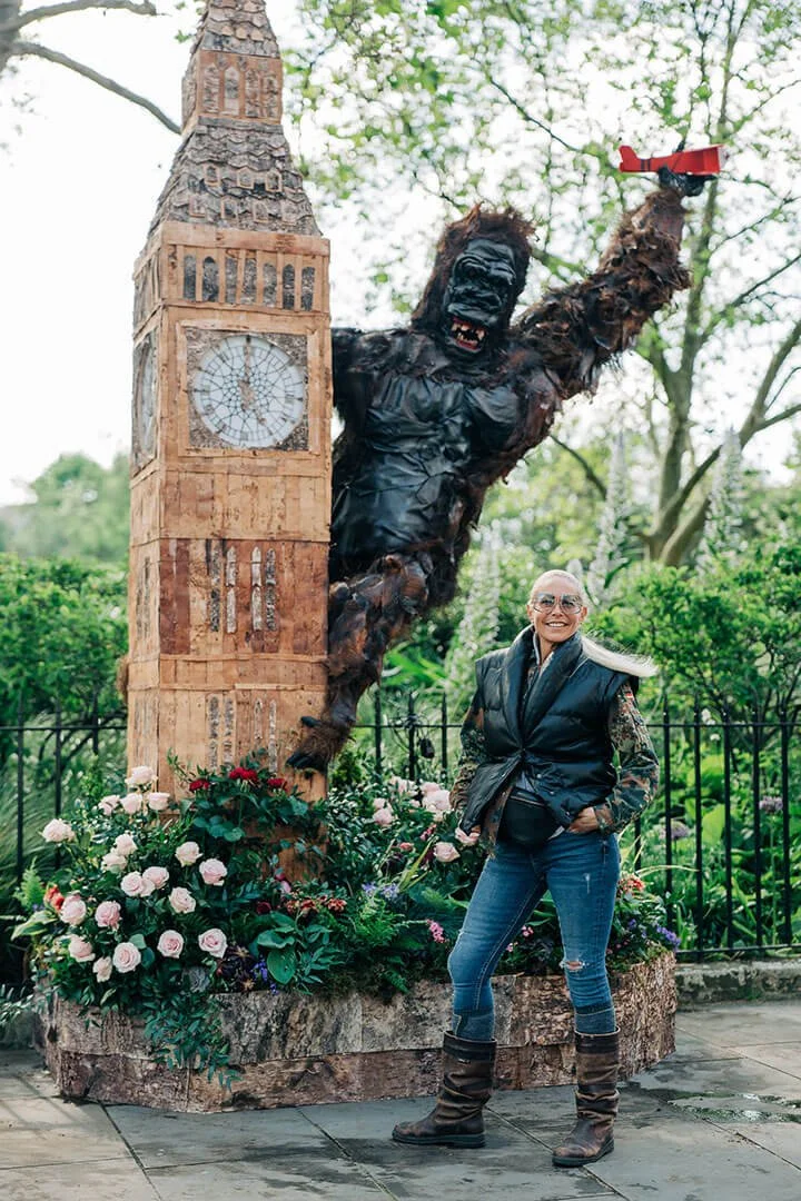 Gracing the corner of Sloane Street and Cadogan Place Gardens, King “Kevin” Kong takes centre stage for this year’s Chelsea In Bloom. Working with the team at Polar Black Events, Kevin is suspended from the iconic London landmark, Big Ben. Intricate details create the 4 metre tall structure including the hand-painted clockface. Hours of work from the Amie Bone team have brought this epochal character to life!